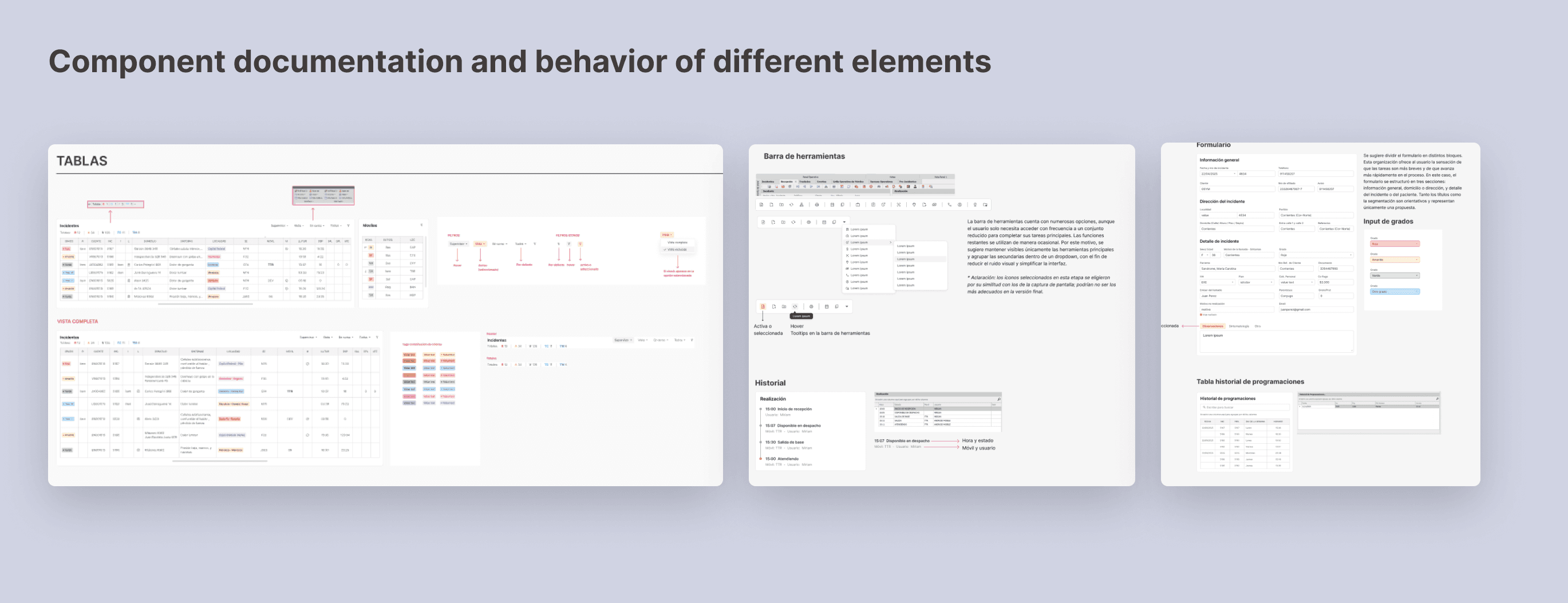 Additionally, tables, charts, and the behavior of different information blocks within each section were designed and documented, ensuring that the interface is clear, coherent, and functional for users in their daily workflows.