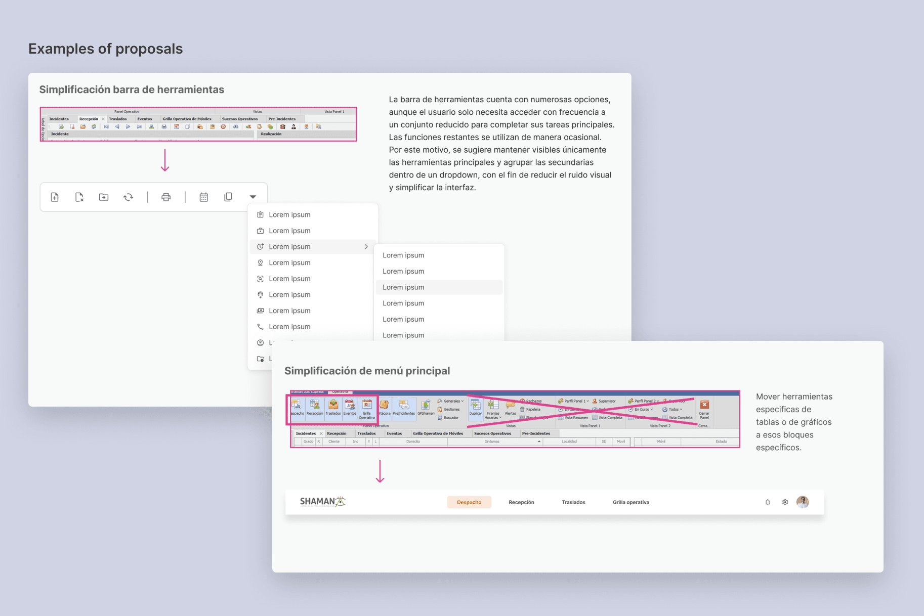 Based on the analysis of the original screens and the workflows provided by the client, specific proposals were developed for each of the sections to be redesigned. During this process, it was identified that, when adapting the system to a web version, each screen contained an excessive number of tools and actions (both primary and secondary), which created visual overload.
